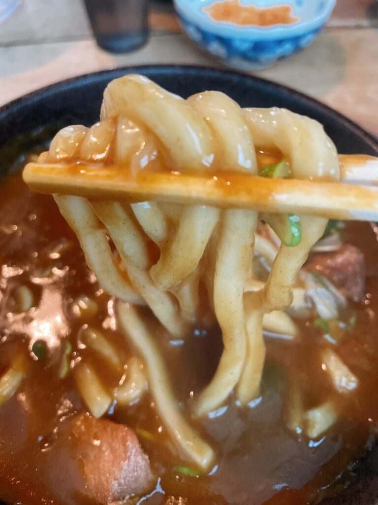 太めのうどんはもちもちとした食感。カレールーはとろみがあり、スパイシーな辛さの中に甘みが感じられ、最後まで飽きずにいただけます。ゴロゴロと入った鶏肉は味がしっかりと染み込んでいて柔らかい。夢中になって食べてしまう美味しさです。