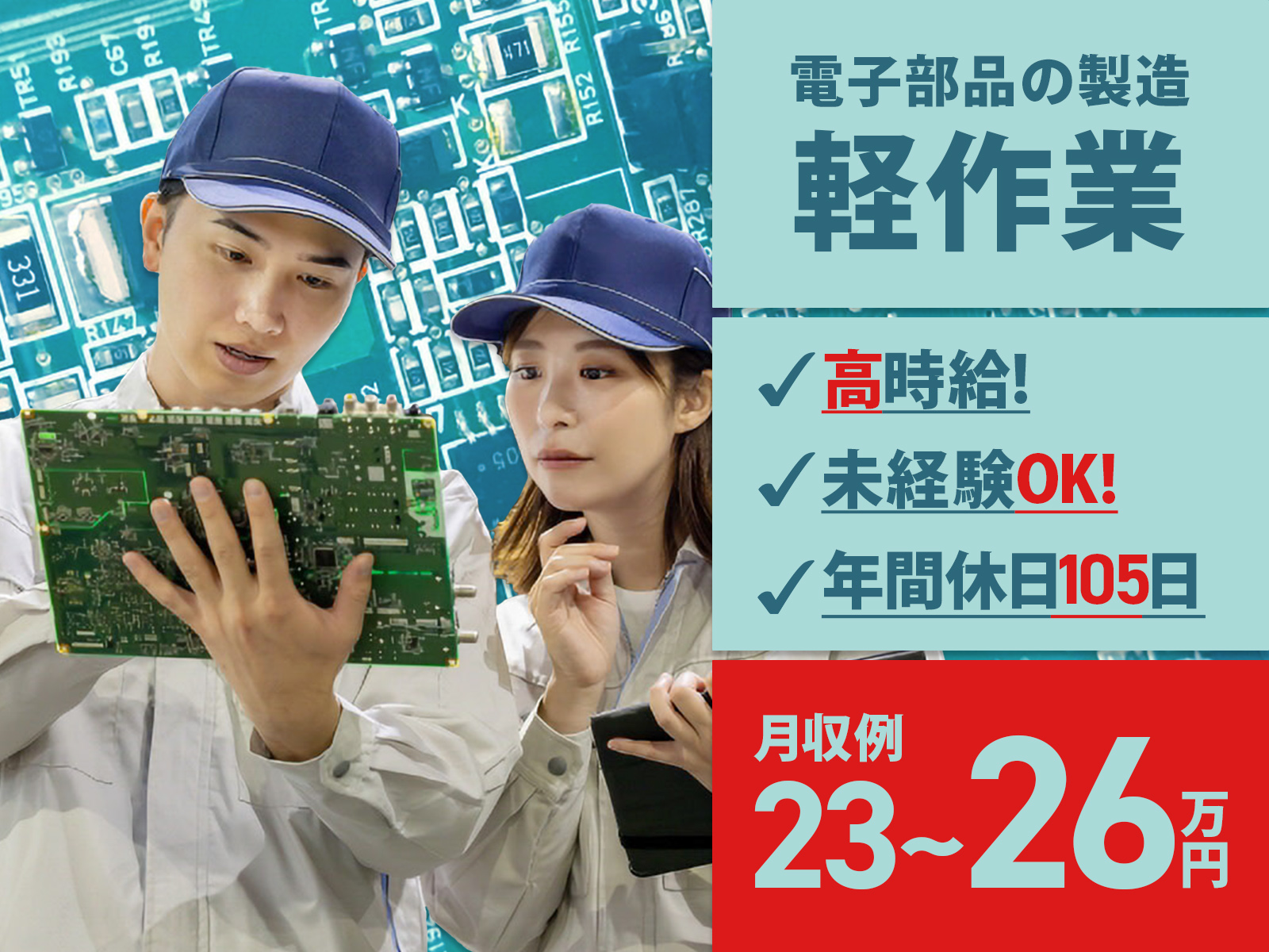 時給:1,450円 残業時、深夜(22時~5時)時の時給:1,813円 月収例:26万円~33万円 ※260,757円~336,903円(21日勤務、残業31時間30分の場合)